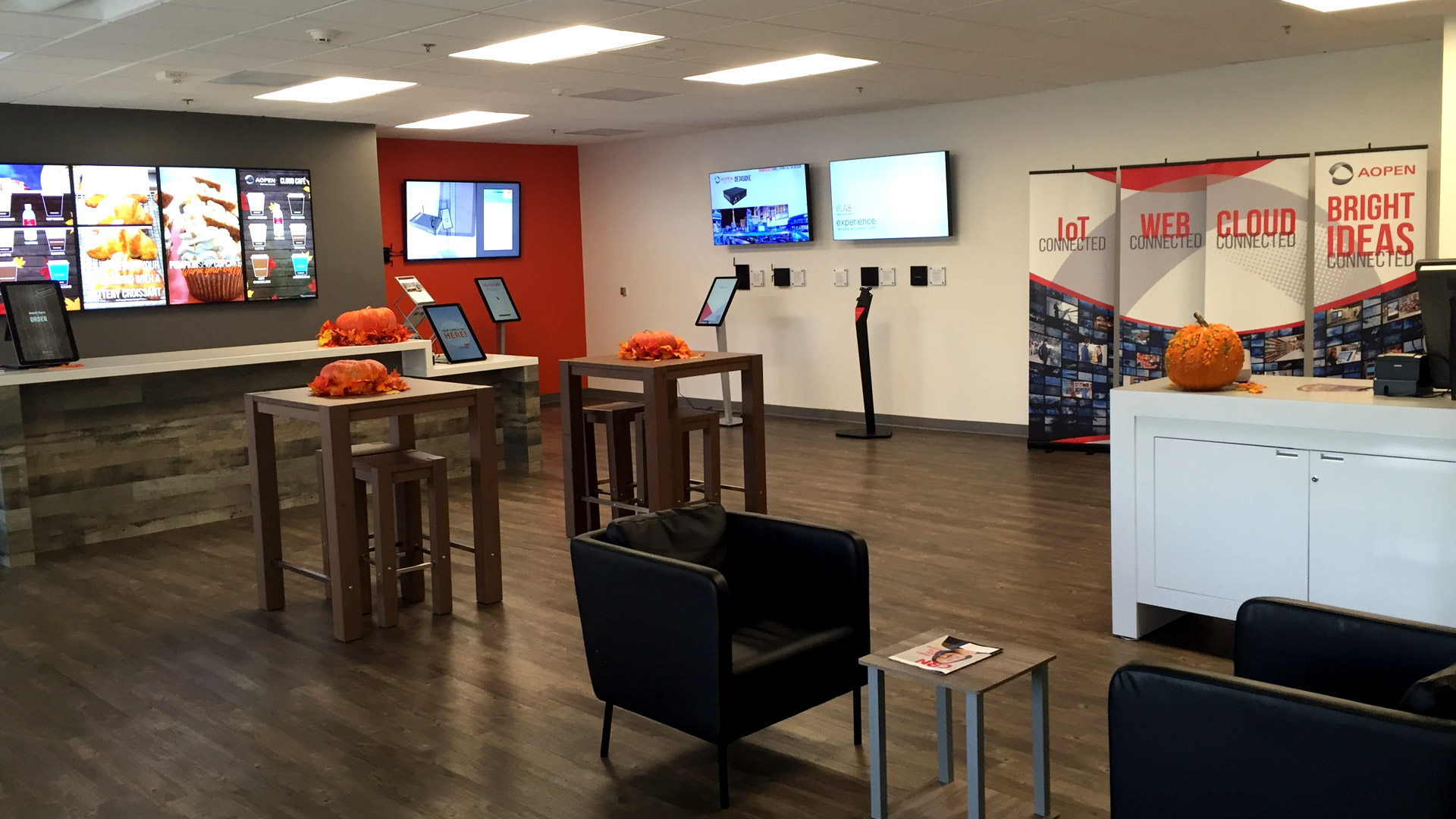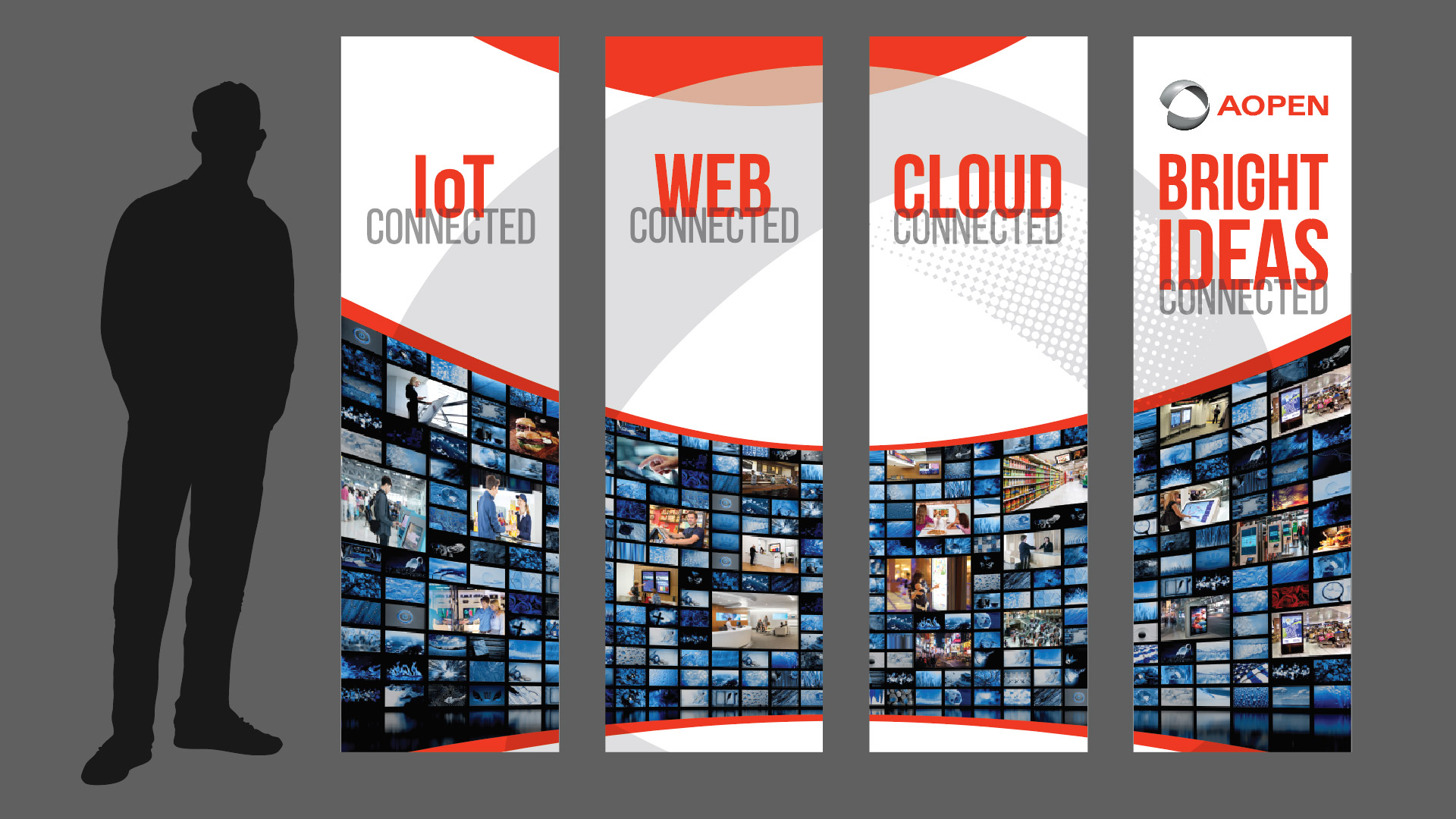 These banners were designed for booth decoration for various sales events, trade shows, and internal demonstration lab. They are placed within close proximity to each other to provide a unified message. The challenge with these banners were creating high-resolution imagery for the non-vector elements. There are 26 individual images representing various verticals that use AOPEN digital signage solutions.