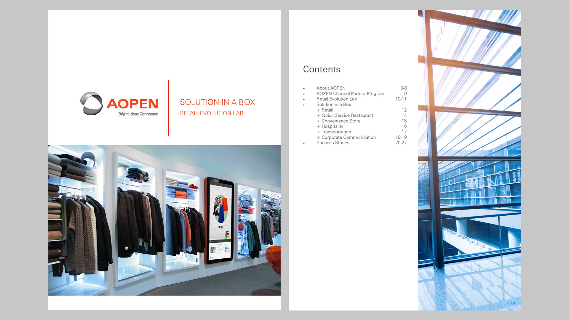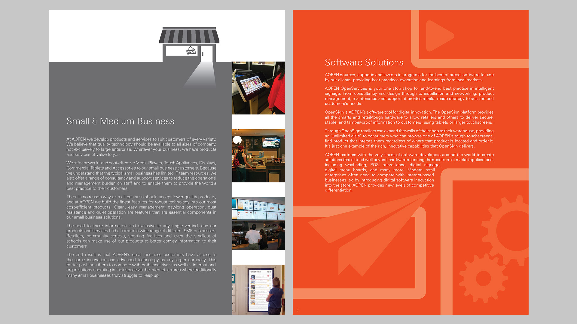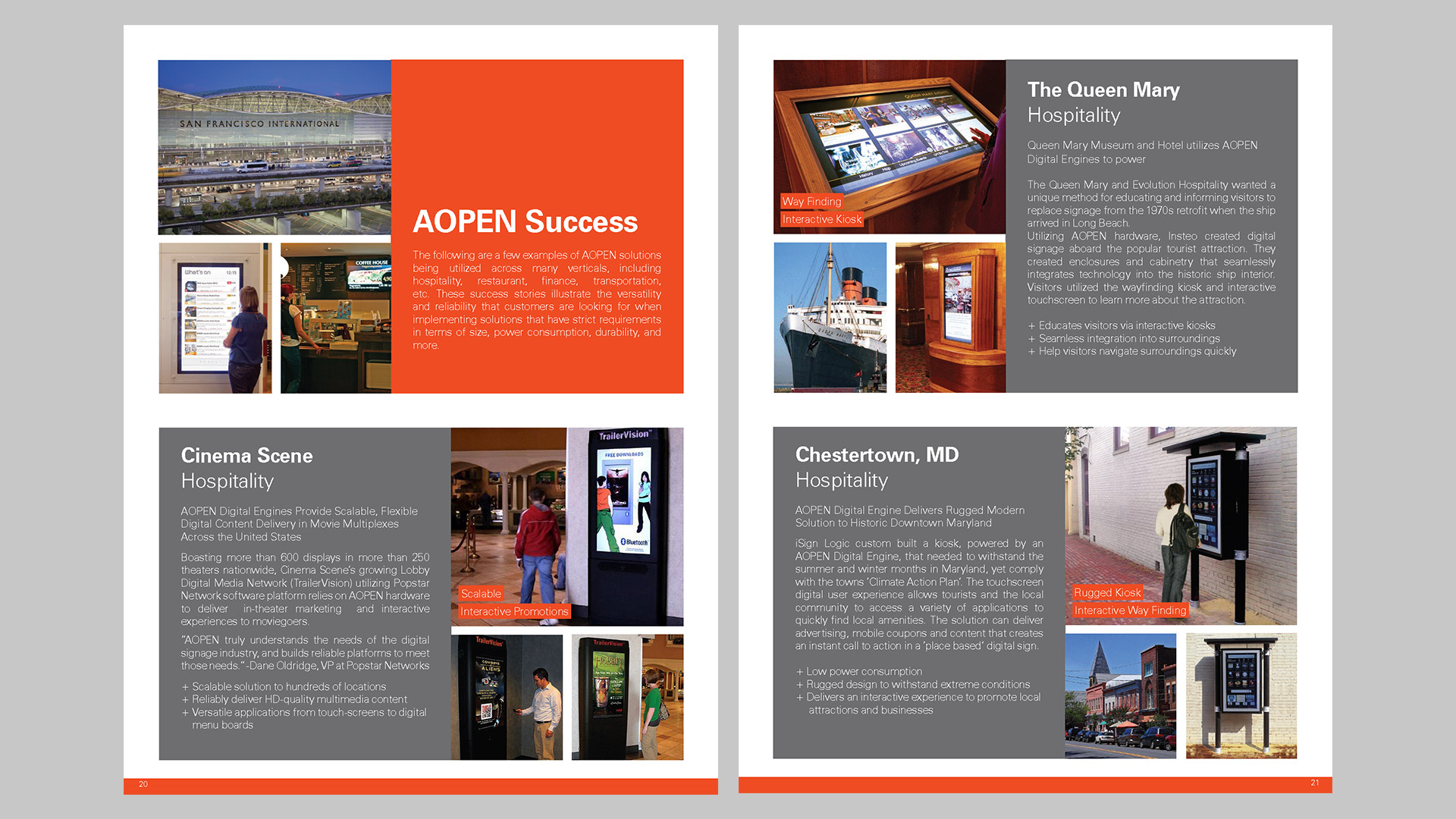 I have created 10+ multi-page brochures for AOPEN, ranging from hardware catalogs, solutions brochures (above), and marketing booklets. These were both in print, for trade events, and digital for customer dissemination. There were all created using Adobe InDesign, Photoshop for imagery and Illustrator for custom vector drawings.